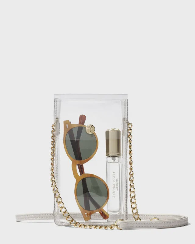 Go hands (and worry!) free with the Clear Small Crossbody. Whether you’re cheering in the stands or jamming at a concert, this compact pouch will keep your phone and essentials secure with its snap closure. Featuring gold chain detailing on its strap, this crossbody is as fashionable as it is practical. 3.75 in (L) x 1 in (W) x 7.25 in (H) (30.5 in with strap)