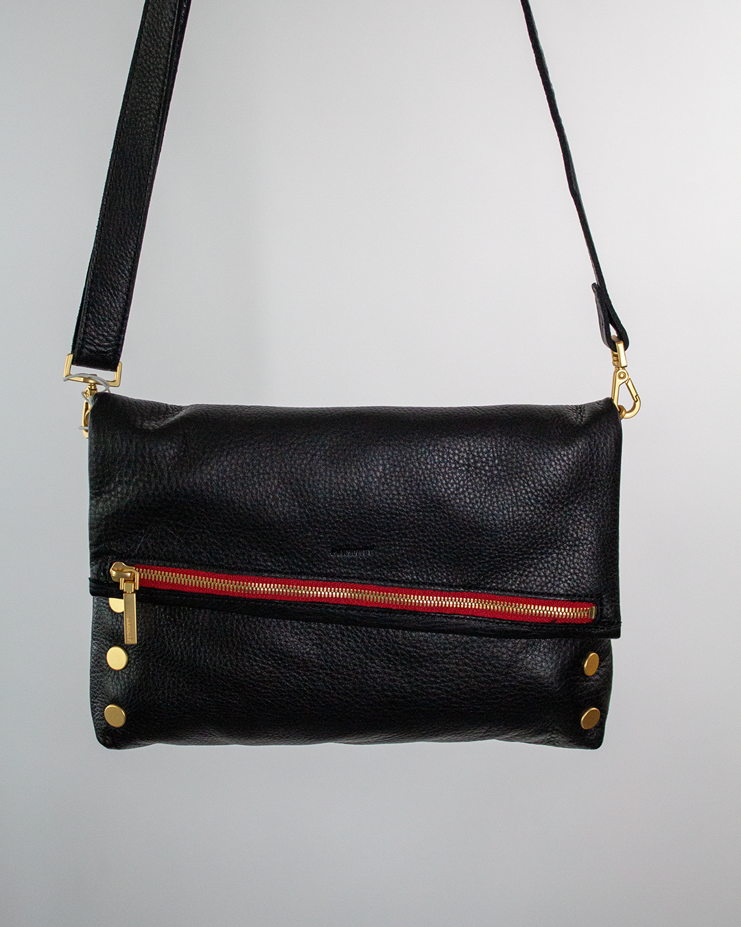 Because you're a VIP. Our all-time best-seller, this VIP in buttery black leather features an optional strap and elevated brushed gold rivets. Plus, you'll find a subtle strip of red peeking out along the bag's back seam. We're classy like that.