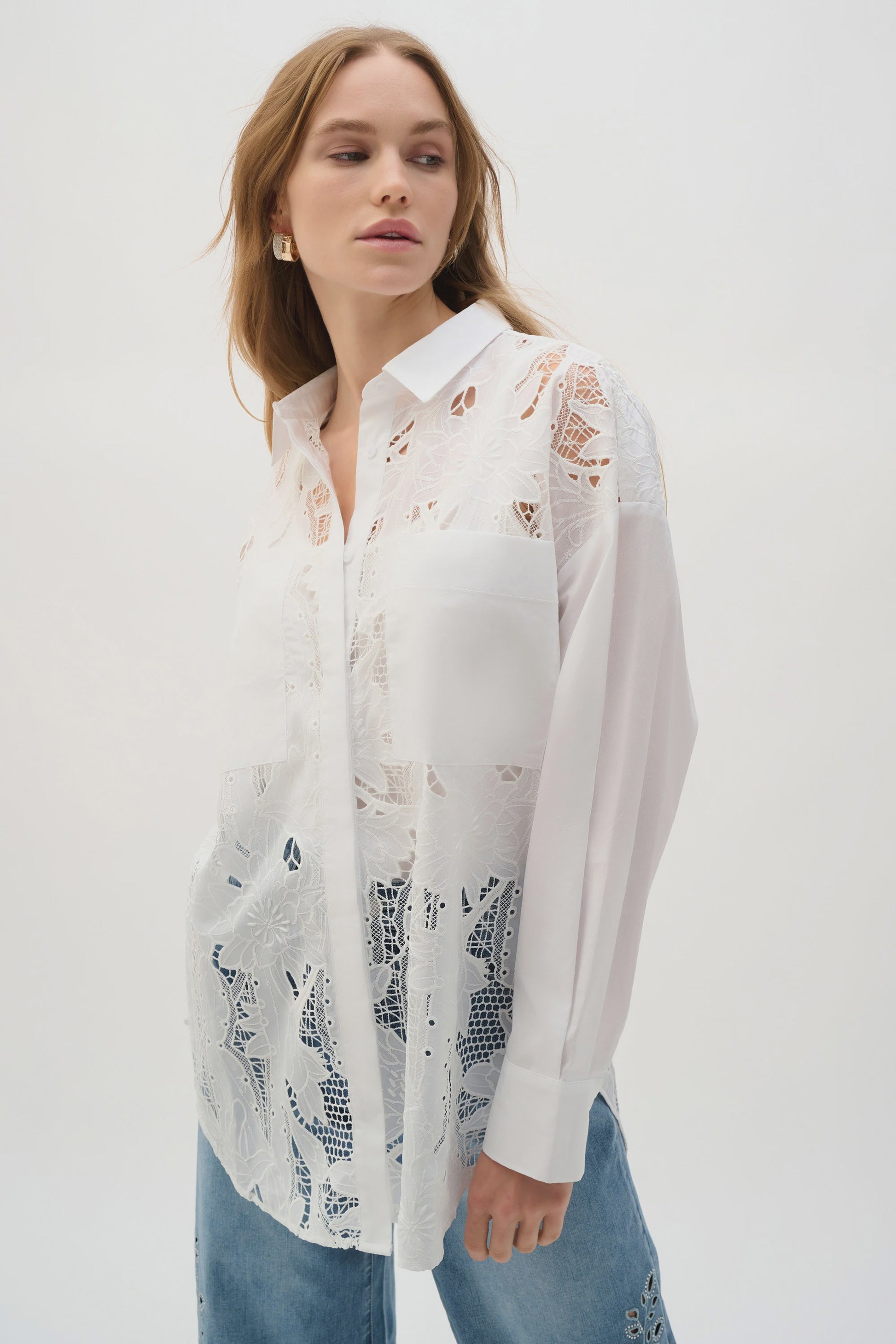 This cotton blouse pairs airy embroidered lace with structured accents at the collar, placket, sleeves, and pockets. Designed in a boxy silhouette, it features a drop shoulder, cuffed sleeves, and a high-low shirttail hem for effortless style.