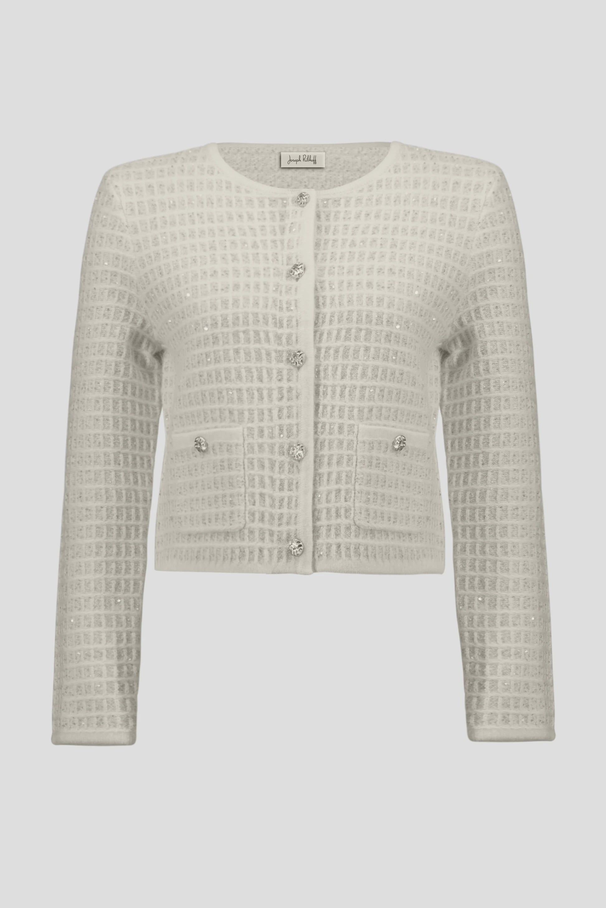 Sequined yarn and gleaming golden buttons give this sweater knit cover-up a dazzling allure. Framed by a classic crew neck and long straight sleeves, it features stylish front pockets adorned with golden buttons, making it a stunning addition to any wardrobe.