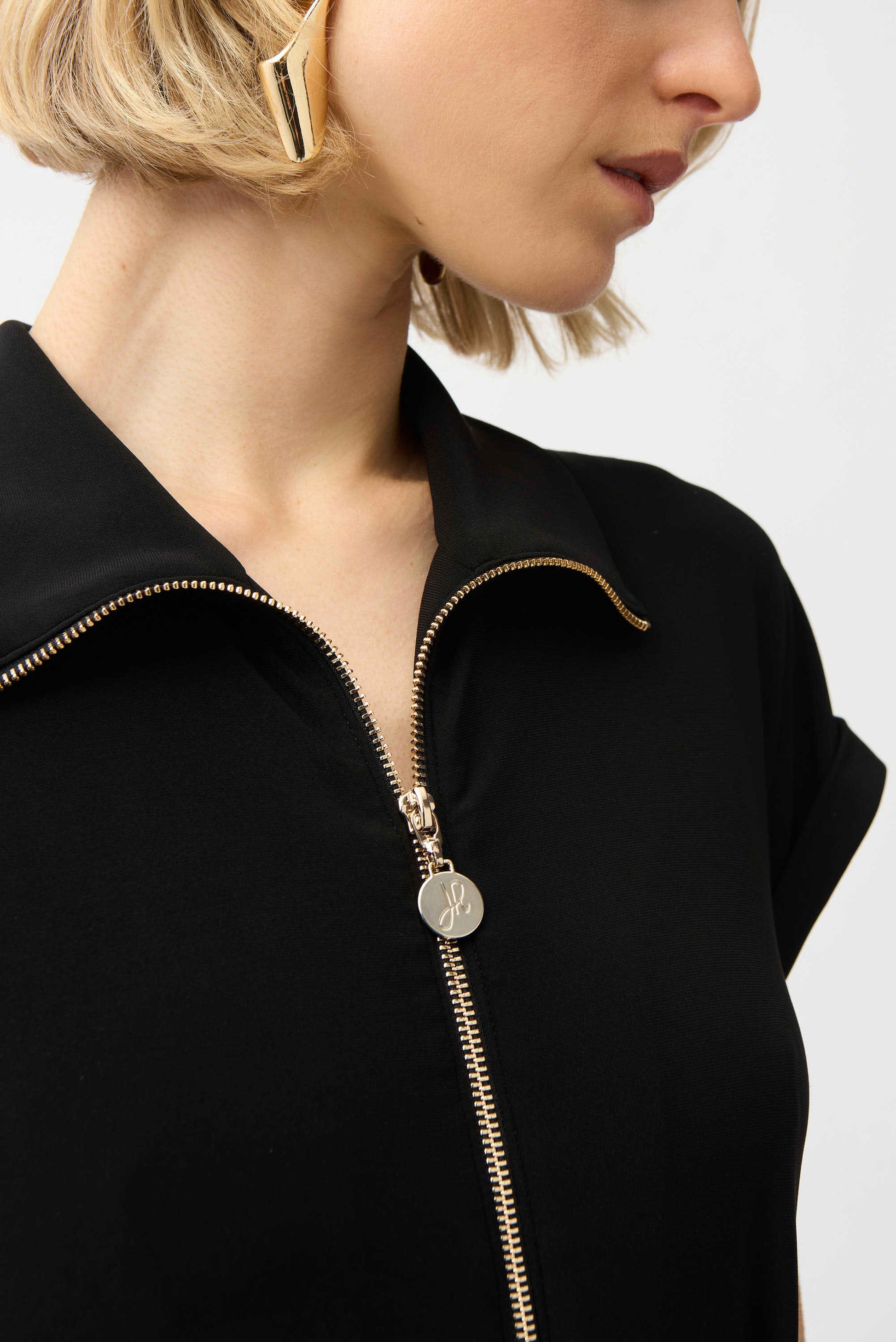 A modern take on a classic wrap, this silky knit culotte jumpsuit features a wide leg silhouette and gold front zipper that flows into a winged shirt collar. Short cuffed sleeves bring balance to the fluid cut.