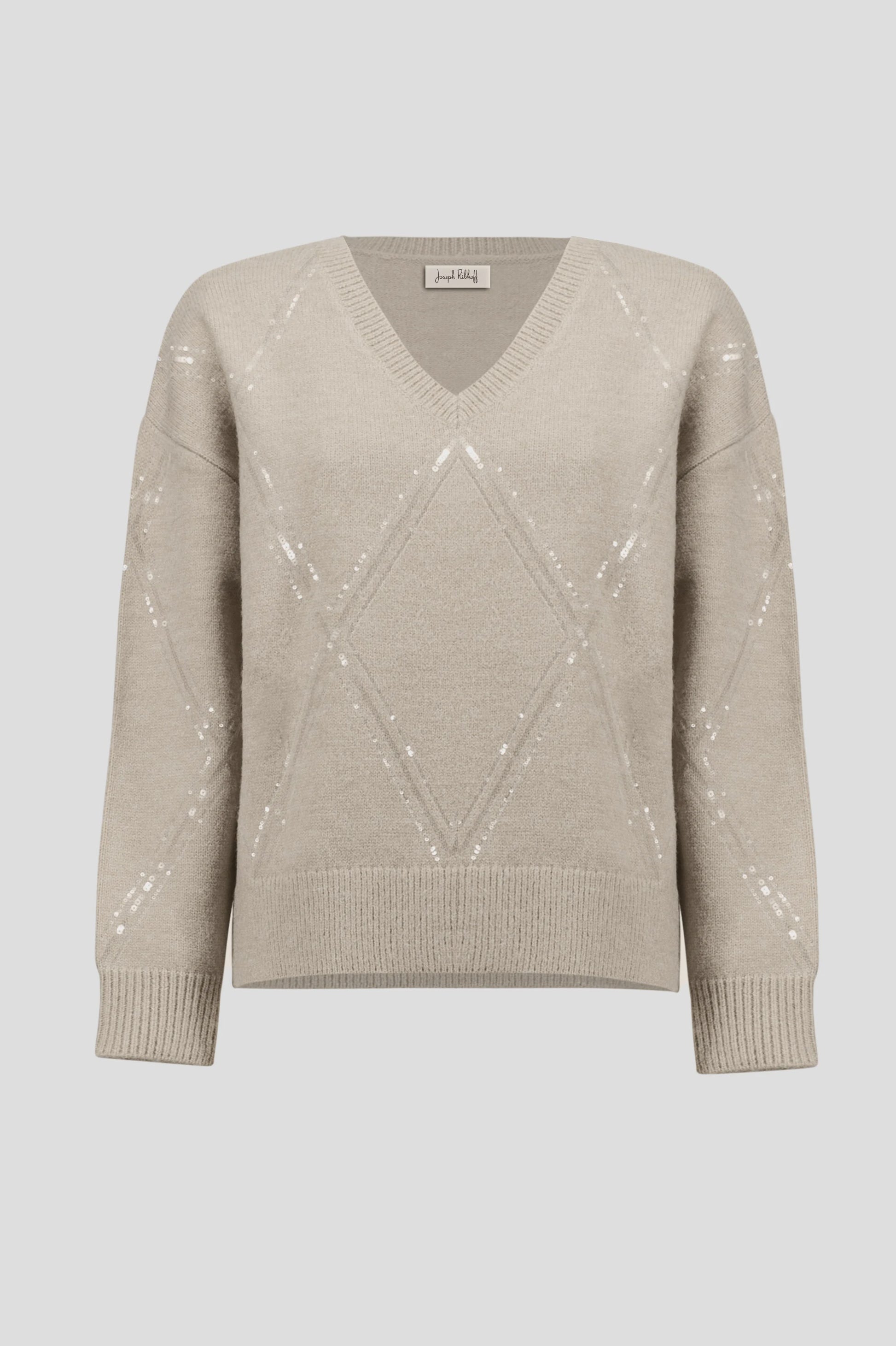 Adorned with a stylish clear sequin design on the front and sleeves, this unique sweater knit pullover adds a touch of charm to your cool-weather wardrobe. A flattering V-neckline, long straight sleeves, and side slits complete the look with simple yet elegant lines.