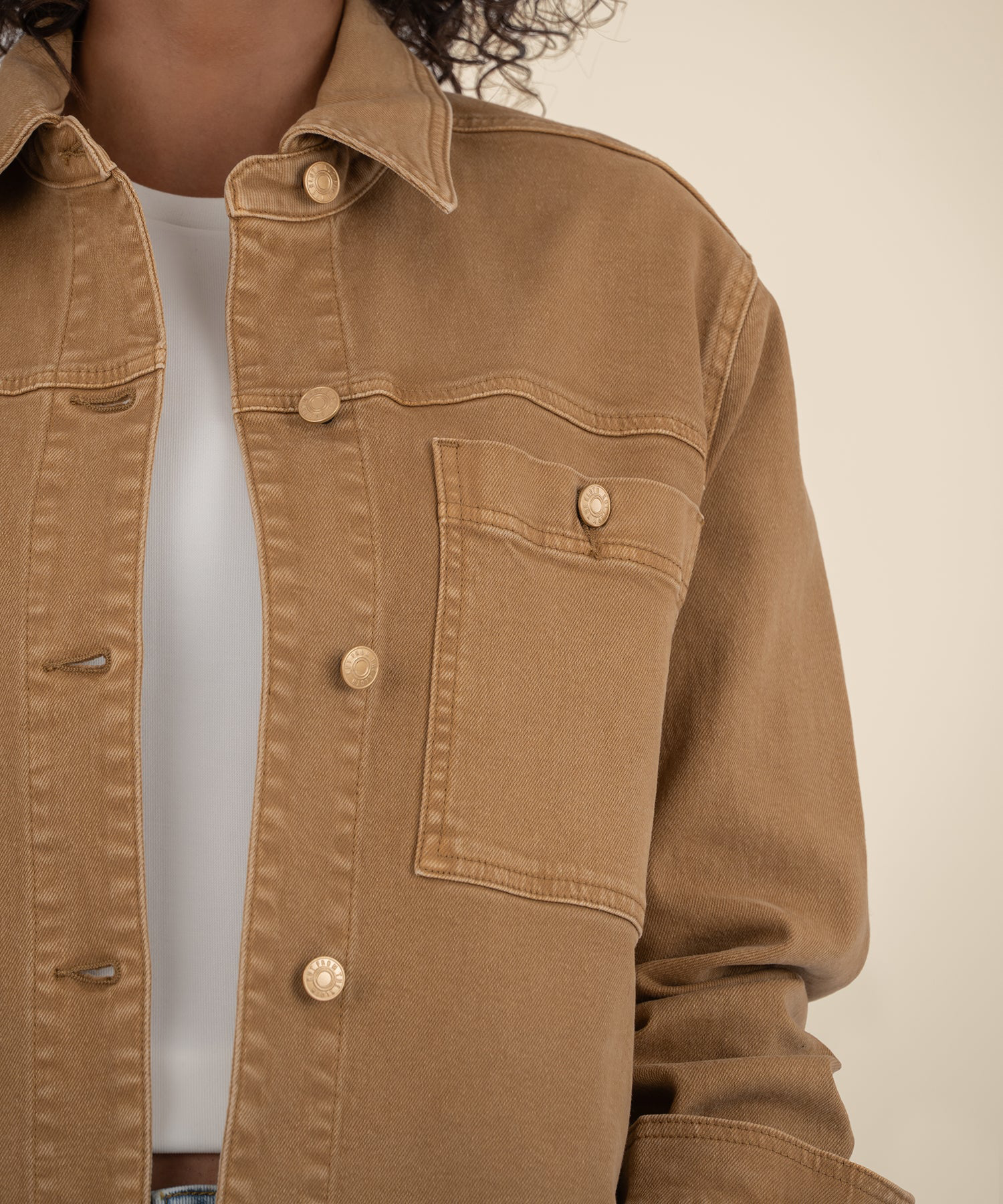 - This caramel-colored jacket features a classic shirt collar and buttoned pockets for a timeless, structured look. Perfect for layering with effortless style.