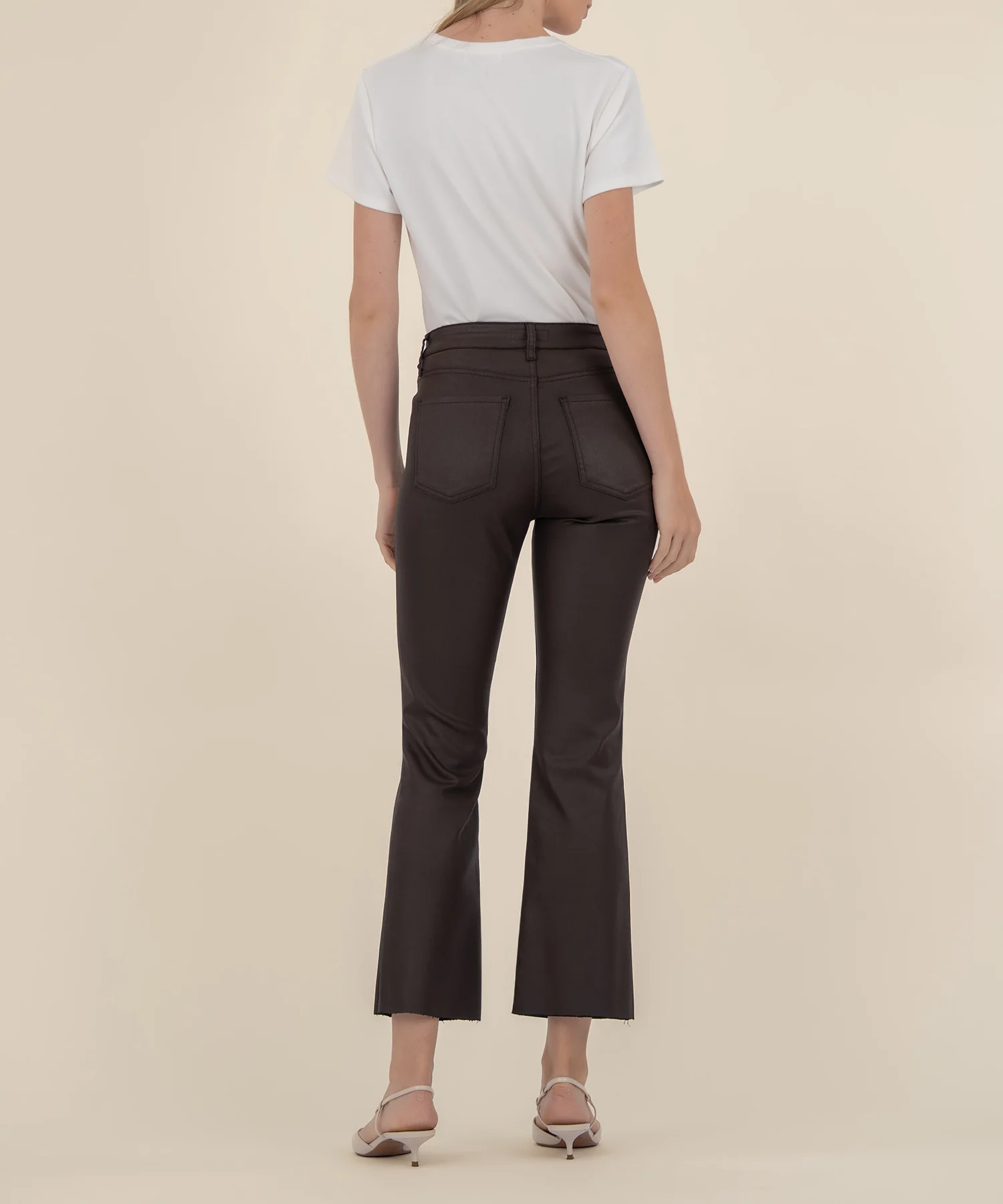 - These high-rise ankle flare pants are crafted from sleek matte coated material that adds a fabulous, modern edge to any outfit. Perfect to dress up or down, they offer a versatile style that transitions effortlessly from day to night. Elevate your wardrobe with these statement-making pants that combine comfort and bold sophistication.