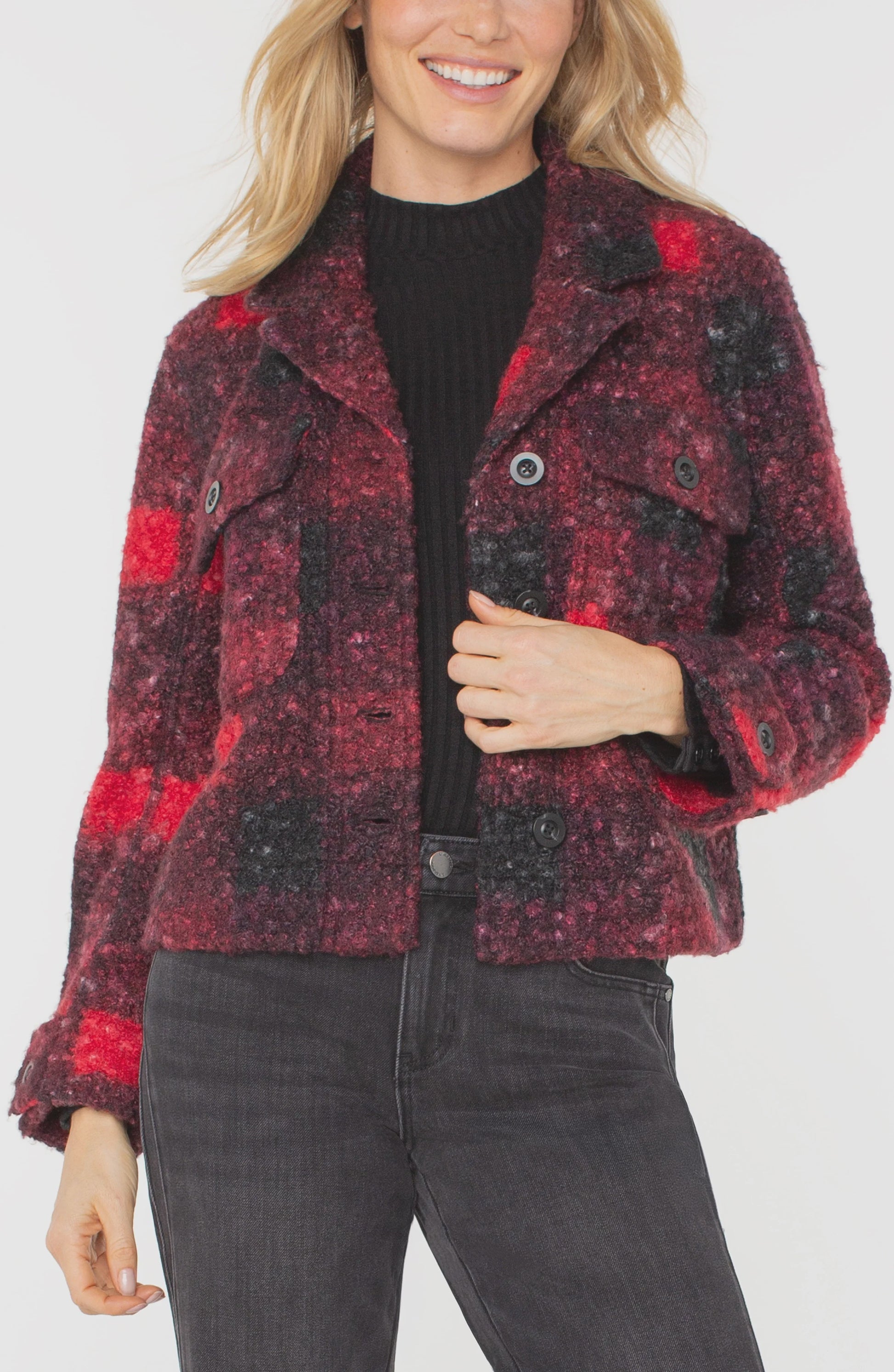 Our boxy-fit shacket in bold red-and-black buffalo check sherpa is equal parts cozy and cool. The textured sherpa fabric adds warmth and dimension, while button-tab cuffs and cropped length keep the look sharp.