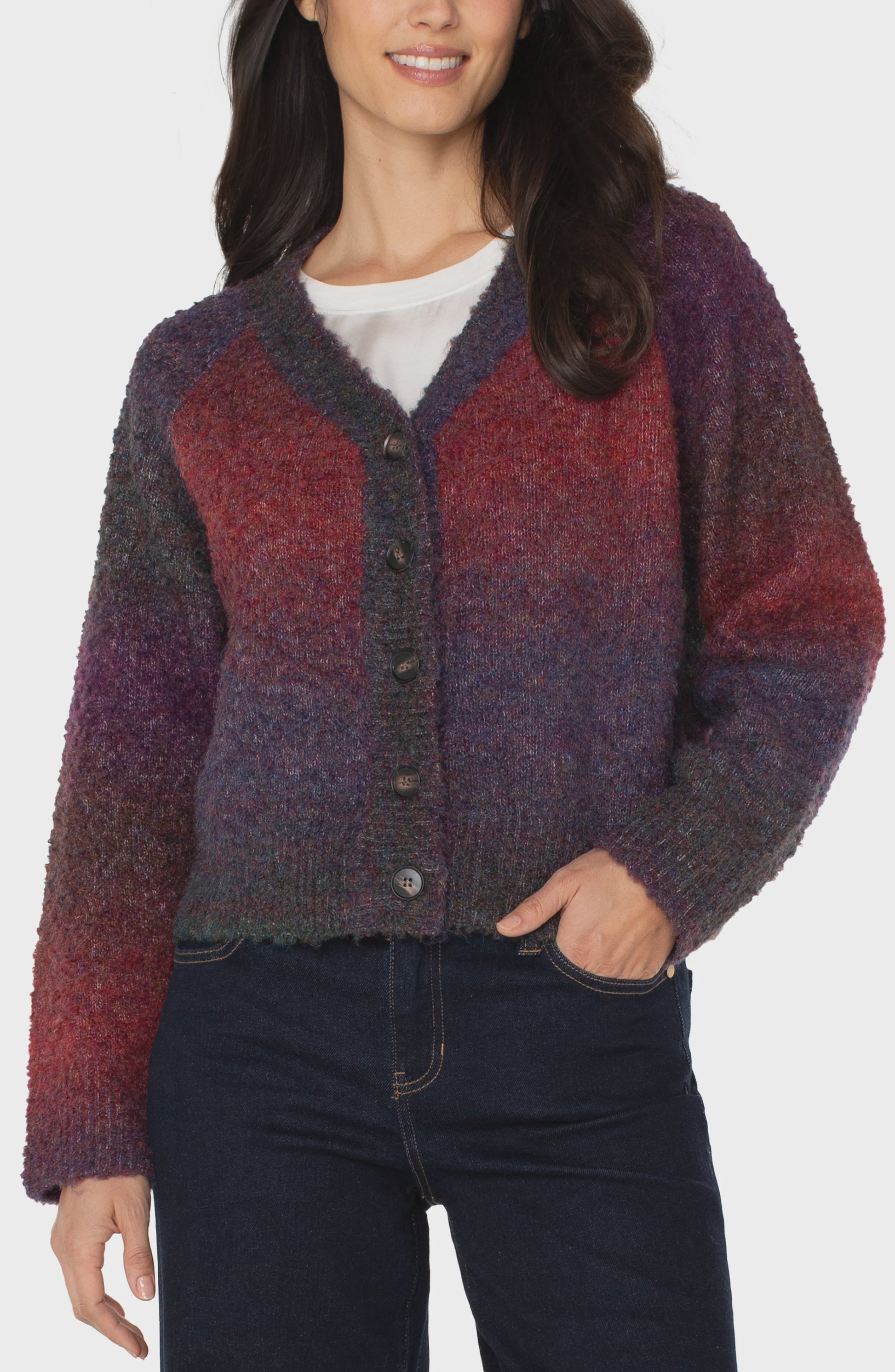 A classic cardigan, reimagined. This ombré knit in rich berry-to-burgundy tones blends timeless design with modern detail. Finished with ribbed trim and button-front closure, it’s the sweater that layers beautifully and stands on its own.