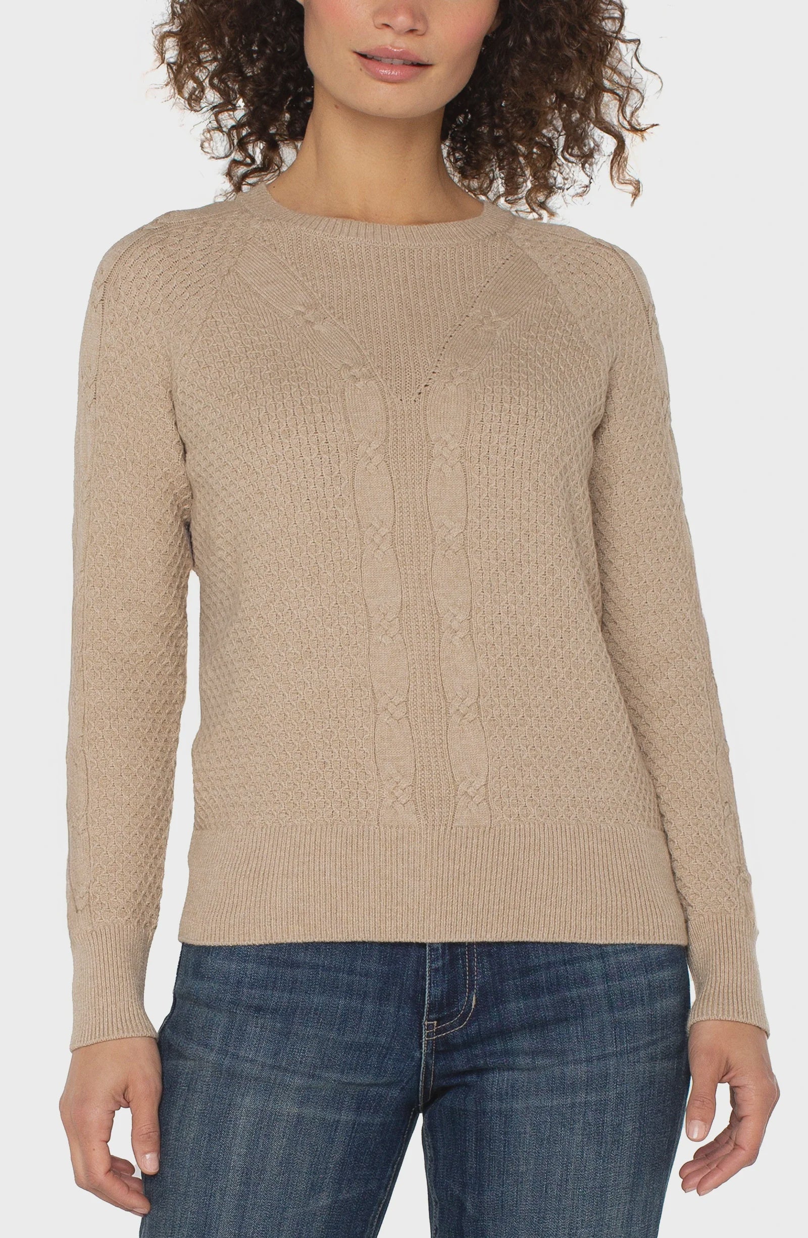 This raglan-sleeve sweater is defined by its timeless cable knit detailing and clean crew neckline. Soft and versatile, it layers effortlessly over shirting or stands alone with denim and trousers—an easy staple for cooler days.