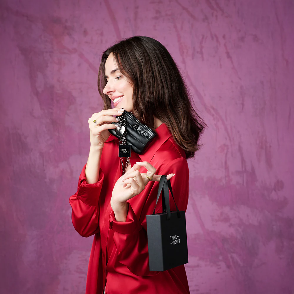 This soft pouch is cozy and perfectly sized for your mini essentials from AirPods to key fob and money or credit cards. This secret stash comes with a detachable chain of detachable charms symbolizing luck and love!