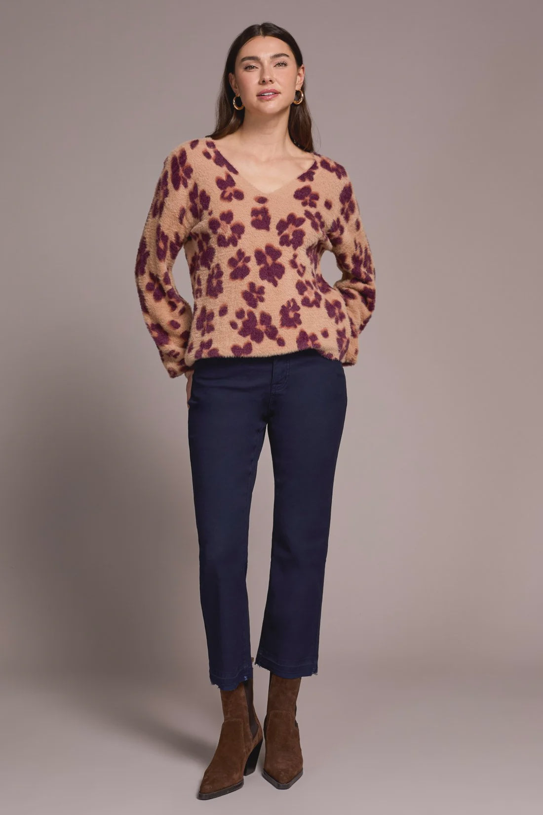 Infuse your everyday style with chic charm and delightful comfort with this floral print sweater. Crafted from soft eyelash yarn, it features a flattering pop-over v-neck design and long bishop sleeves, imparting an airy feel and fashionable flair to your ensemble.