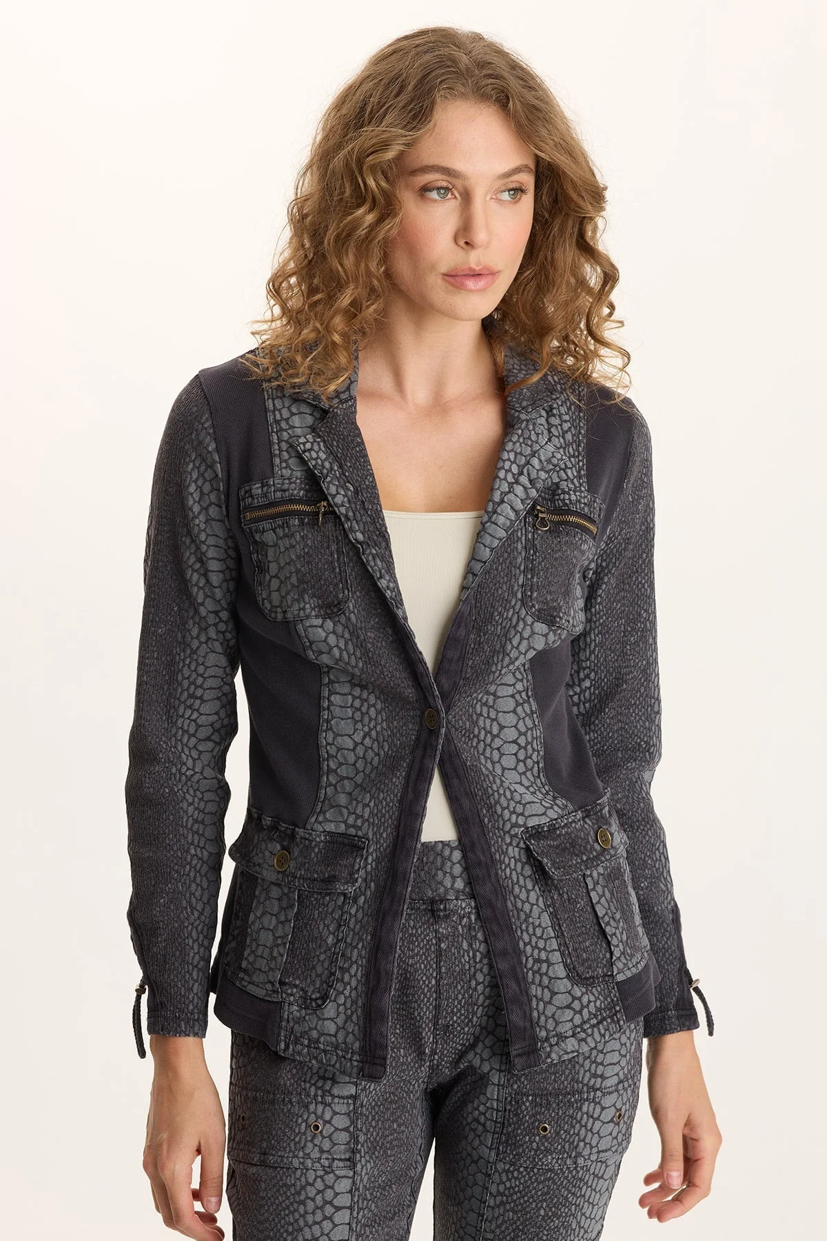 In unique textured Camille Jacquard, the Kirkyln Blazer features a split collar, stretchy inserts for ease of movement, and antique brass hardware adorning each pocket. With adjustable cords at each cuff and a flexible yet fitted silhouette, Kirklyn is here to spice up your style!